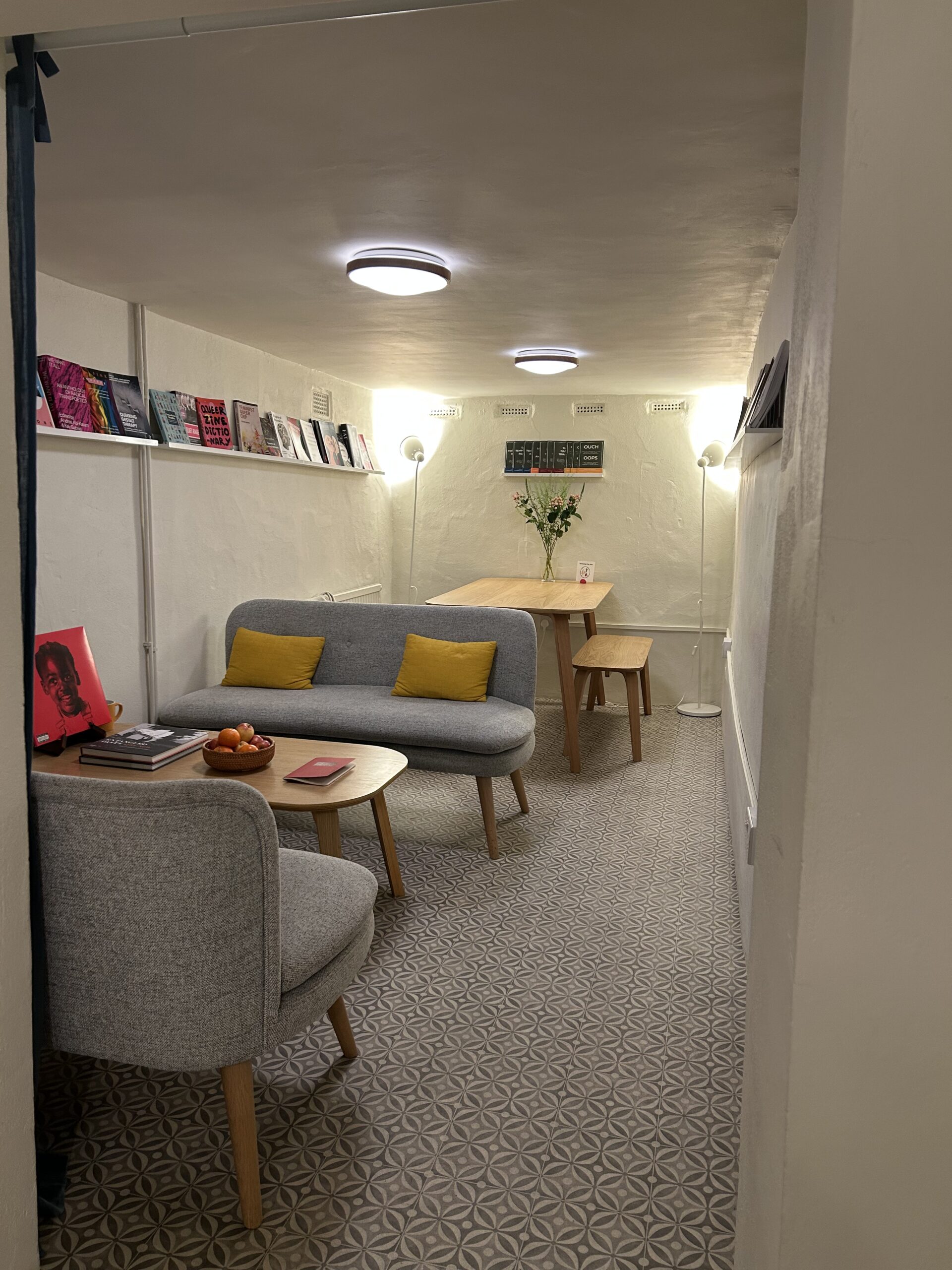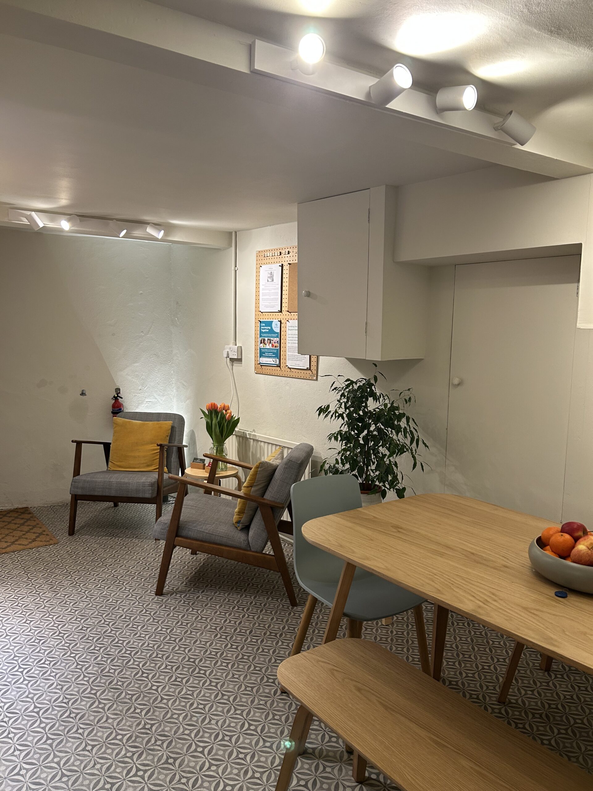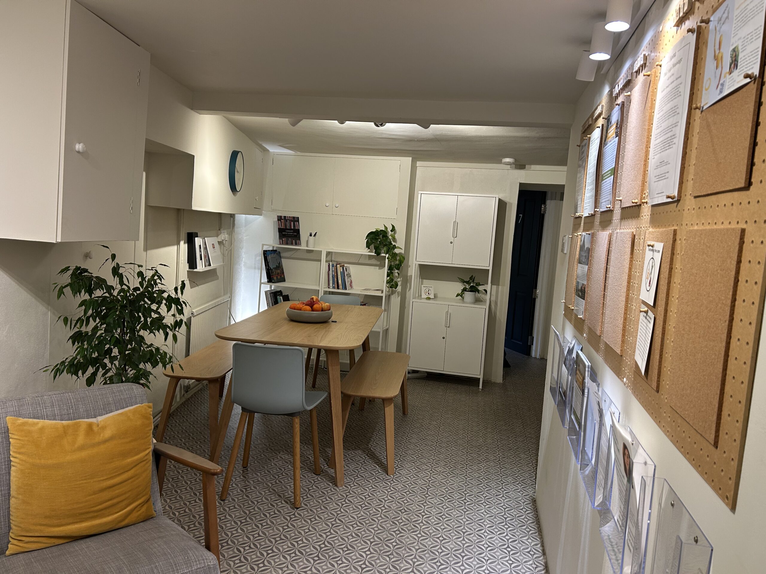 Our freshly decorated kitchen is a warm and welcoming space. There is filtered water, a full range of speciality teas, and plenty of biscuits. Next to the kitchen, there’s plenty of space to sit down and relax, either on your own or in larger groups.