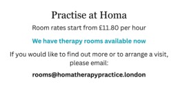 If you are looking for a therapy room to rent and you would like to visit Homa, please call Emma on 07746 716546 or email her anytime.